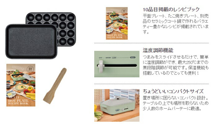 10品目掲載のレシピブック 温度調節機能 ちょうどいいコンパクトサイズ 特徴 □ 温度調節機能 □ マグネットプラグ式 □ たこ焼き24個 □ 最大250度 □ 付属品:平面プレート、たこ焼きプレート 木製ヘラ、レシピブックかわいいチェック柄の、プレート着脱式ホットプレート 2〜3人用におすすめのホットプレート。