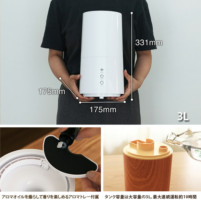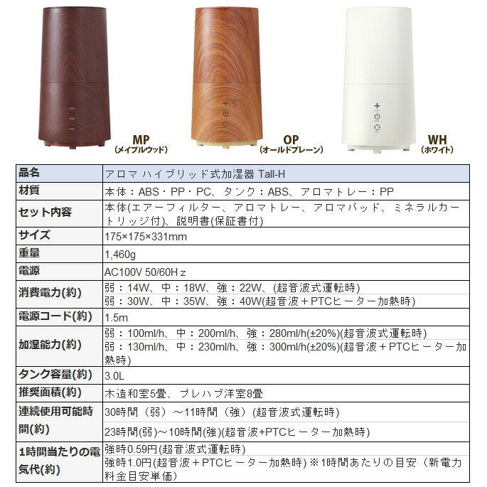 サイズ 175×175×331mm 材質 本体:ABS・PP・PC、タンク:ABS、アロマトレー:PP バリエーション オールドプレーン、メイプルウッド、ホワイト 付属品 本体(エアーフィルター、アロマトレー、アロマパッド、ミネラルカートリッジ付)、説明書(保証書付) 納期 5日から10日程度 その他 【重量】1460g 【電源】AC100V 50/60Hz 【消費電力(約)】弱:14W、中:18W、強:22W、(超音波式運転時)、弱:30W、中:35W、強:40W(超音波+PTCヒーター加熱時) 【電源コード】1.5m 【加湿能力(約)】弱:100ml/h、中:200ml/h、強:280ml/h(±20%)(超音波式運転時) 、弱:130ml/h、中:230ml/h、強:300ml/h(±20%)(超音波+PTCヒーター加熱時) 【タンク容量(約)】3.0L 【推奨面積(約)】木造和室5畳、プレハブ洋室8畳 【連続使用可能時間(約)】30時間(弱)〜11時間(強)(超音波式運転時) 、23時間(弱)〜10時間(強)(超音波+PTCヒーター加熱時) 【1時間あたりの電気代(約)】強時0.59円(超音波式運転時)、 強時1.0円(超音波+PTCヒーター加熱時) ※1時間あたりの目安(新電力料金目安単価) 送料 送料無料 ※北海道・沖縄・離島・一部地域を除く